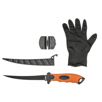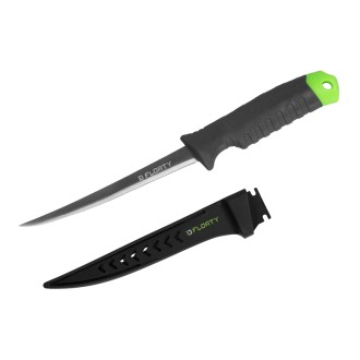 Nóż do filetowania ze stali nierdzewnej z miękką ergonomiczną rękojeścią wraz z pochewką.